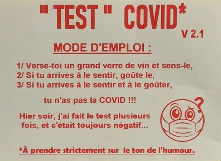 Alors soyons légers et vidons nos verres de "Qu'on vide-19" après nous être fait tester avec le "Test Covid" et en attendant d'être vacciné par le "Vaccs'vin", mais "A chacun le sien".