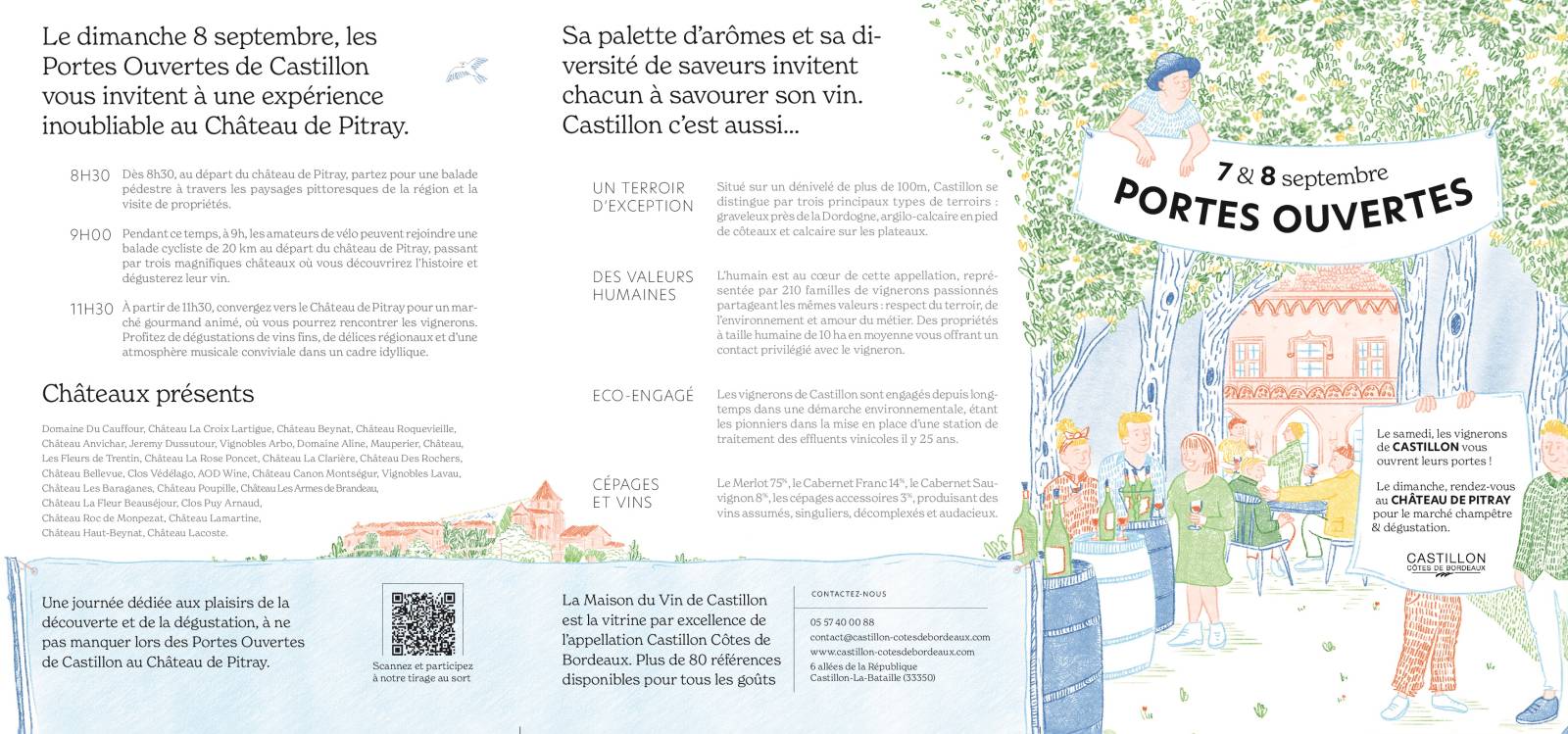 Visite & dégustation, restauration sur place avec le food truck «Burger et Vous», promenade autonome «Biodiversité» et vente directe au château avec promotions spéciales portes ouvertes pour les enfants et activités diverses.